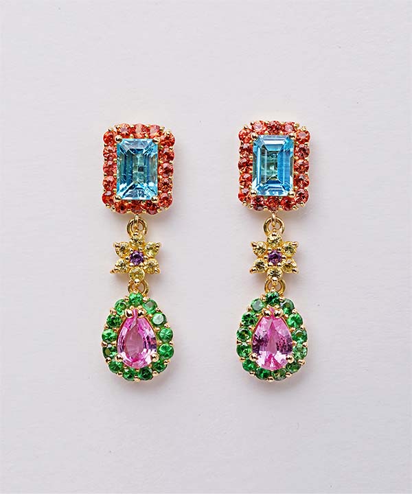 写真は18KYG、ブルートパーズ、オレンジサファイア、イエローサファイア、ピンクサファイア、グリーンガーネット、アメジストを使用。サイズ:H約25mm×W約7mm