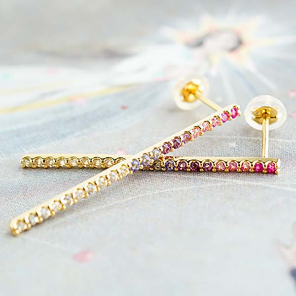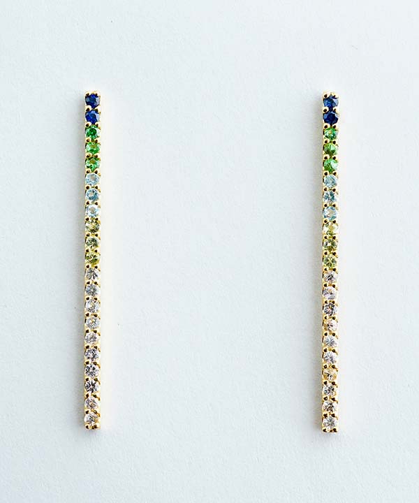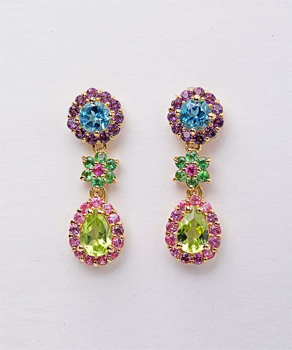 写真は18KYG、グリーンガーネット、ブルートパーズ、ピンクサファイア、アメジスト、ペリドットを使用。サイズ:H約22mm×W約6.5mm