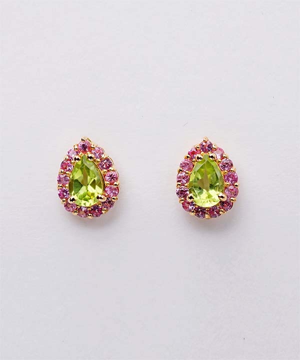 アラビアとラテン語の造語で「静かな水」を意味するミアプラキドゥスは雫型のペアシェイプが美しいピアス。写真は18KYG、ピンクサファイア、ペリドットを使用。サイズ:H約9mm×W約7mm