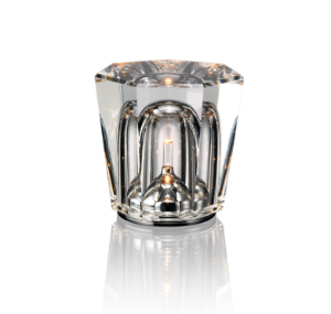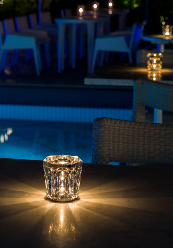 ソリッドガラスによる幻想的な煌めきと、放射状に広がる灯りが美しい、パーソナルなコードレステーブルランプ。独自開発されたダブルサイドLEDや滑らかな局面のメタルリフレクター、明るさをコントロールできる3段階の調光制御、防水機能を備えています。熟練の職人による手作業で丁寧にカットされているため、スタイリッシュな中にもどこか温もりを感じられます。