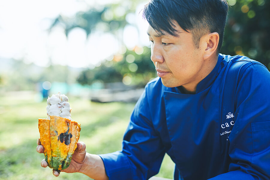 「素材を選ぶときは必ず現地に足を運び、どのような想いで生産者の方が素材を育てられているか話を聞き、一緒に収穫をし、商品のアイデアを伝え、本当にご一緒したいと思ったものを選ぶようにしています。生産者の方の想いを聞いているからこそ、チョコレートだけが主役にならないように素材とのバランスがなるべく1:1になるよう作っています。素材の香り・風味を最大限引き出すため、掛け合わせるカカオの種類から選んでいます。これは自社でカカオの栽培・加工から手掛けているからこそできることですね」(MAISON CACAO石原紳伍さん)