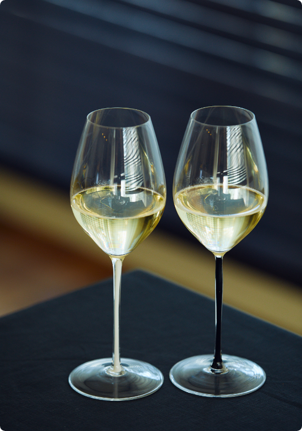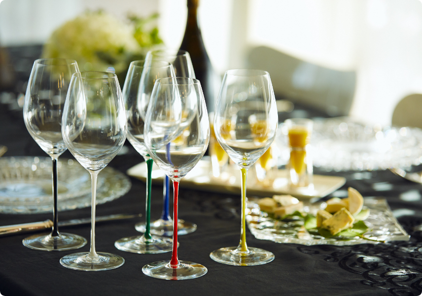 「ステム(持ち手)が細く長くてフォルムがとてもエレガント。繊細な口当たり、そしてシャンパーニュの香り、味わいを最大限に楽しめるという機能性も兼ね備えています。ステムのカラーはゲストのイメージに合わせてチョイスしたり、ひと目で自分のグラスと分かり易く、グラスマーカー要らずで楽しめます。」
